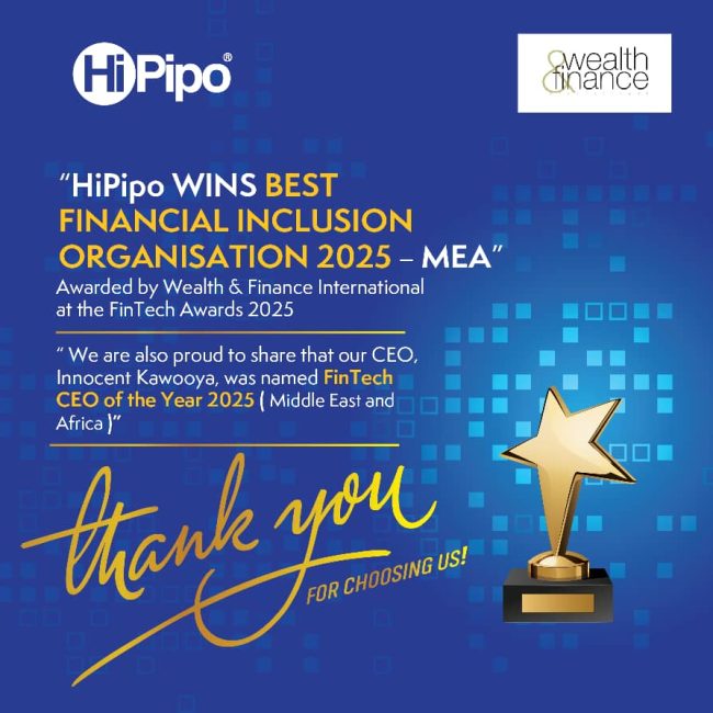 HiPipo CEO Innocent Kawooya, NIM has been named FinTech CEO of the year 2025 for Middle East and Africa (MEA).
