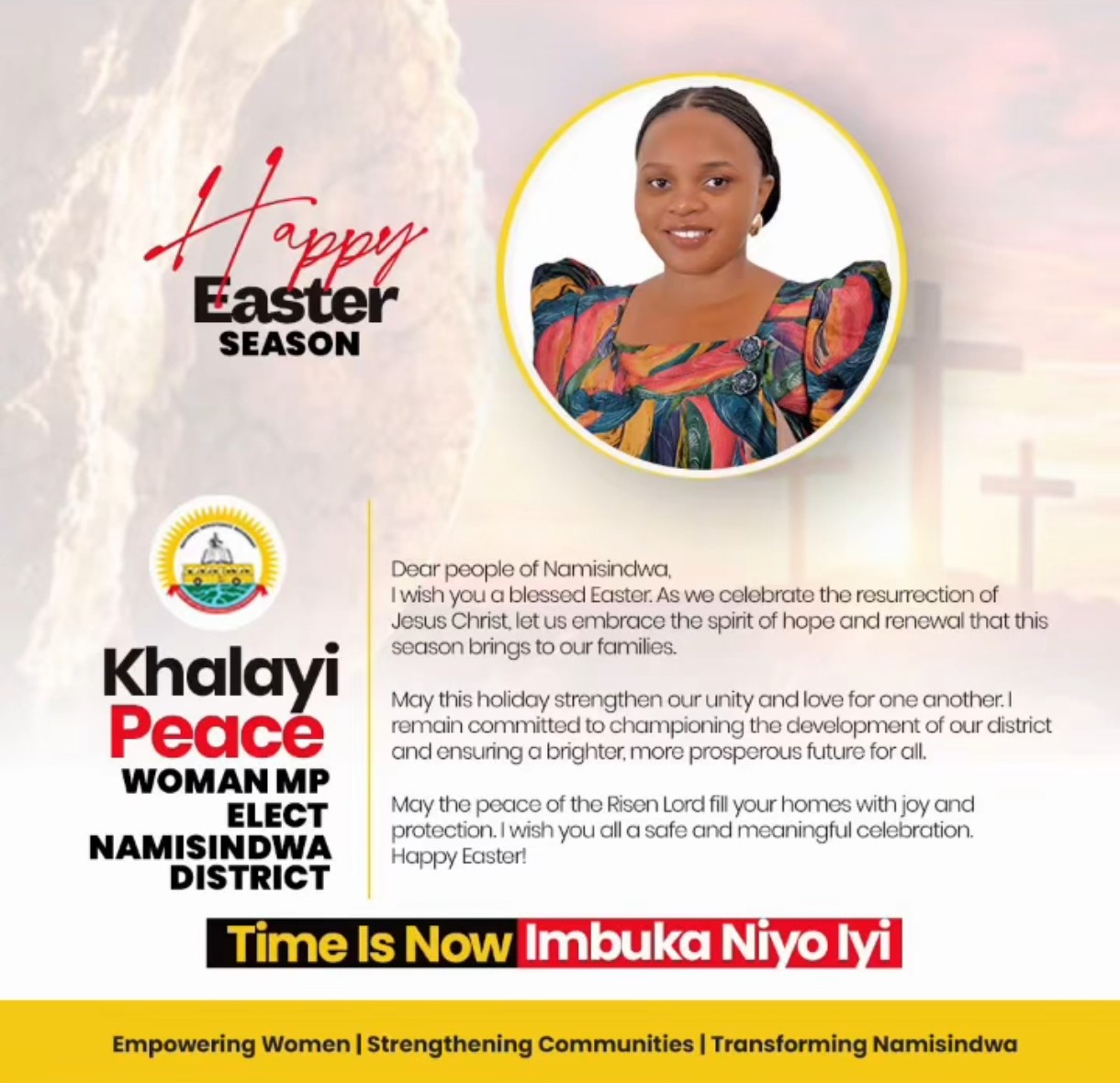 “Dear people of Namisindwa. I wish you a blessed Easter. As we celebrate the resurrection of Jesus Christ, let us embrace the spirit of hope and renewal that this season brings to our families. May this holiday strengthen our unity and love for one another. I remain committed to championing the development of our district and ensuring a brighter, more prosperous future for all. May the peace of the Risen Lord fill your homes with joy and protection . I wish you all a safe and meaningful celebration. HAPPY EASTER,” Hon. Khalayi Peace.