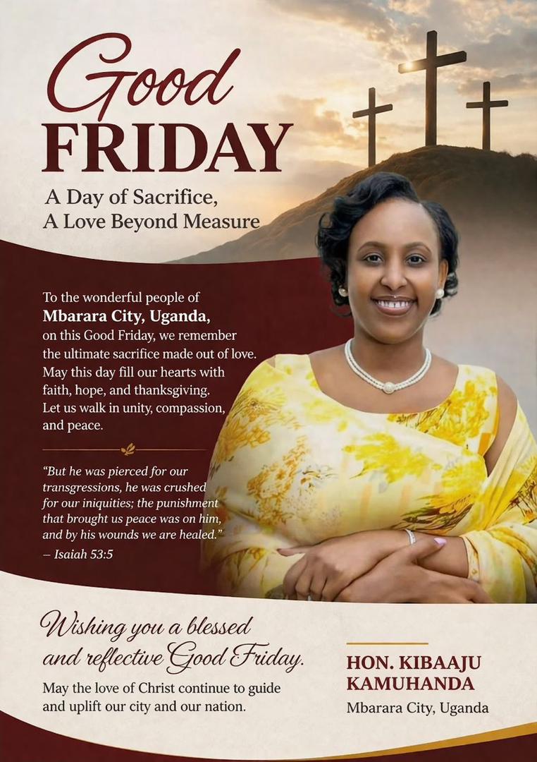 To the wonderful people of Mbarara City, Uganda, on this Good Friday, we remember the ultimate sacrifice made out of love. May this day fill our hearts with faith, hope, and Thanksgiving. Let us walk in Unity, compassion and Peace. Wishing you a blessed and reflective Good Friday. May the love of Christ continue to guide and uplift our city and our nation,” Hon. Kibaaju Charity Kamuhanda, Mbarara City, Uganda.