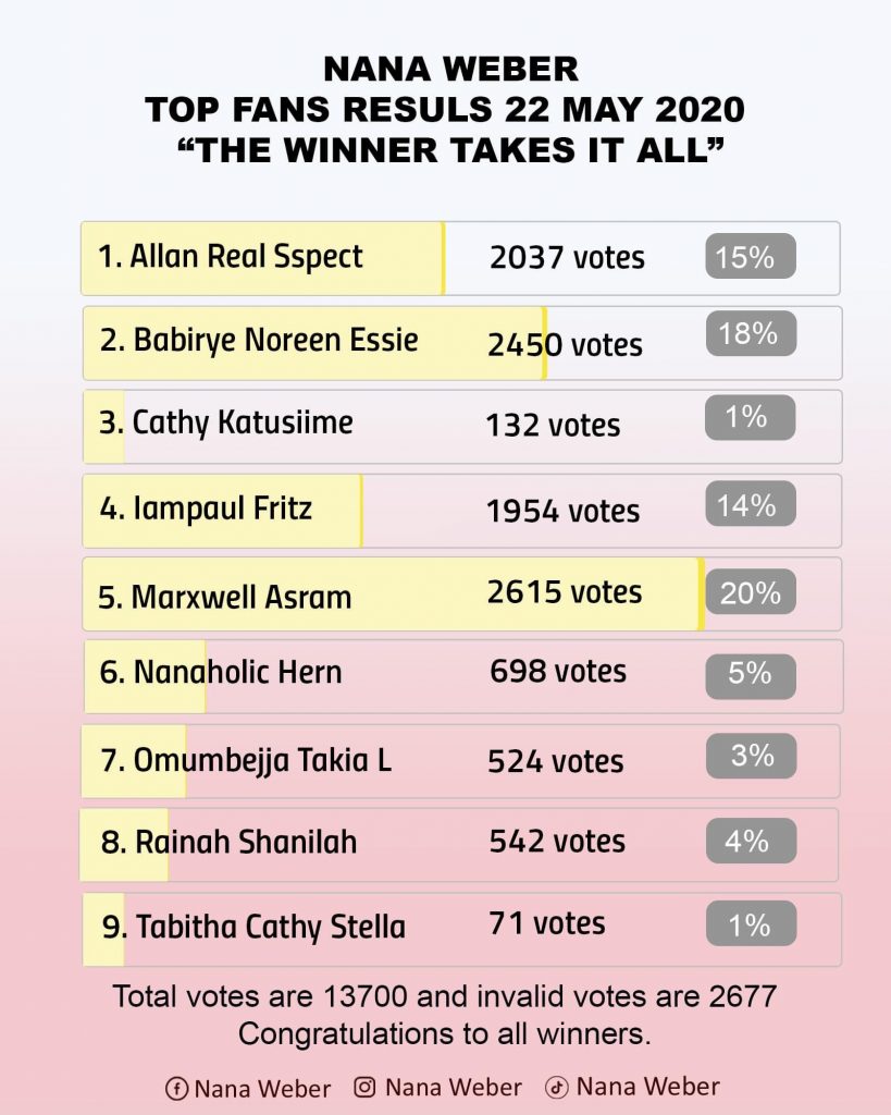 He has come on top in a short list of 9 competitors. Marxwell polled 2615 votes coming on top with the highest number of votes against his closest rival Babirye Noreen Essie who scored 2450 votes.