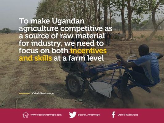 To make Ugandan agriculture competitive as a source of raw material for industry, we need to focus on both incentives and skills at a farm level. A tractor at the farm with no trained operators in the neighborhood as a talent pool, no service, repair and parts workshop at each district level, means we will continue to attract more rudimentary tools to grow food for an expanding population.