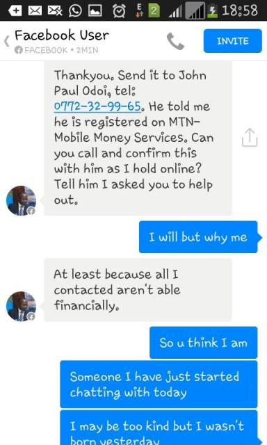 The conman went on to tell Daphine that the doctors wanted advance payments and told her to send mobile money of 200k on an MTN line and she would be refunded later. Daphine who was having a bad day knew this was a conman and she immediately posted the chat on her Facebook wall and the conman blocked her immediately.