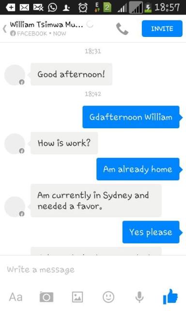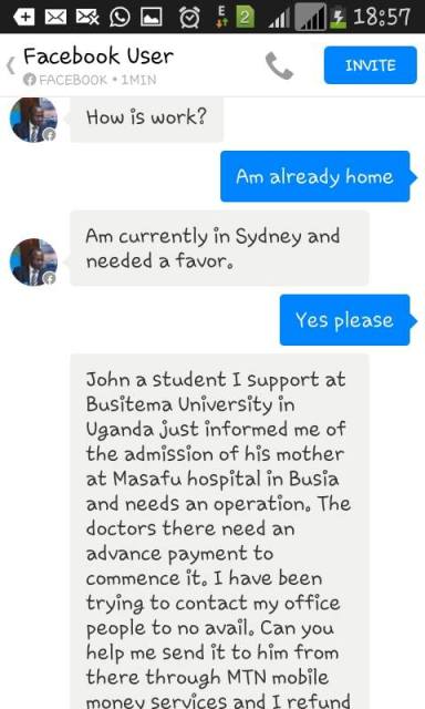 A one William who claimed that he was in Sydney Australia said his friend John, a student of Busitema University had just informed him of his mother’s admission at Masafu Hospital in Busia and she needed an operation.