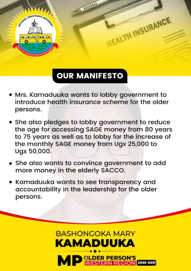 She wants to lobby government to introduce health insurance scheme for the older persons and also wants government to reduce the age for accessing SAGE money from 80 years to 75 years and lobby to increase monthly SAGE money from UGX 25, 000 to 50,000.